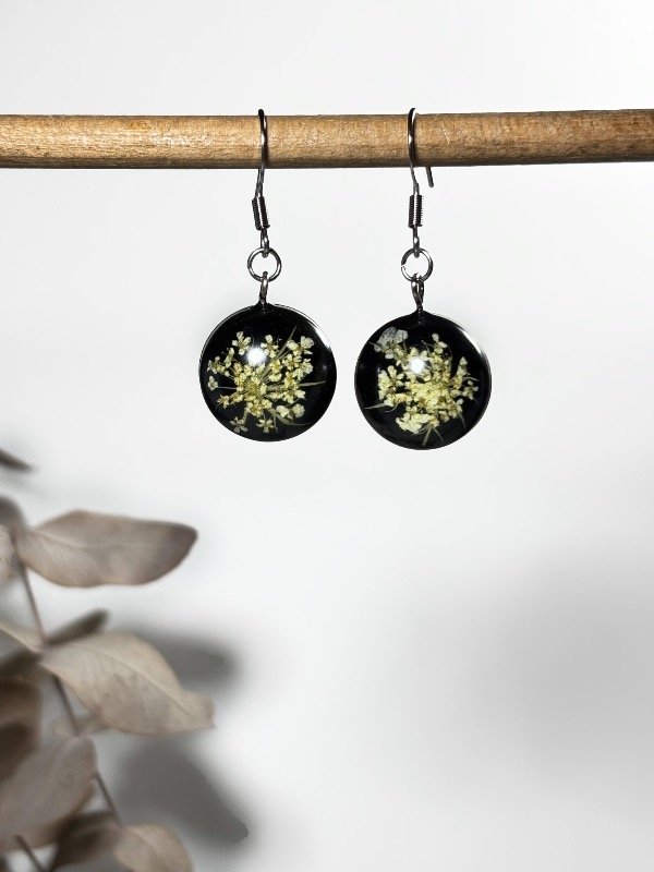 Aros de acero quirúrgico con flores de Espuma de mar (Ammi maju) encapsuladas en resina