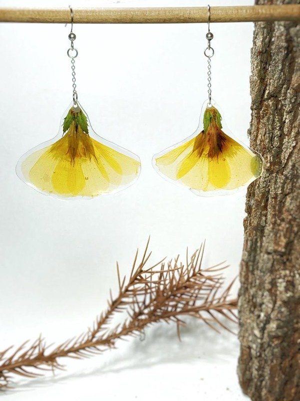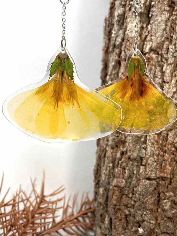 Aros de acero quirúrgico plateado con flores amarillas encapsuladas en resina