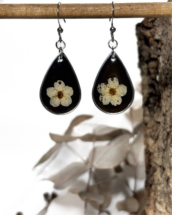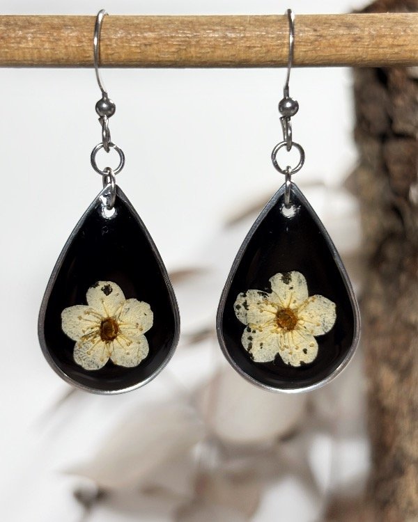 Aros en acero quirúrgico con flores de Corona de Novia encapsuladas en resina