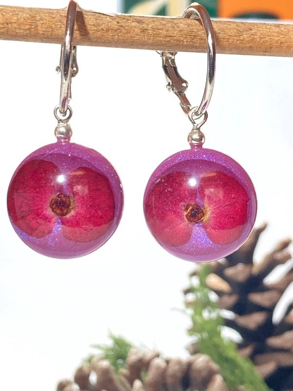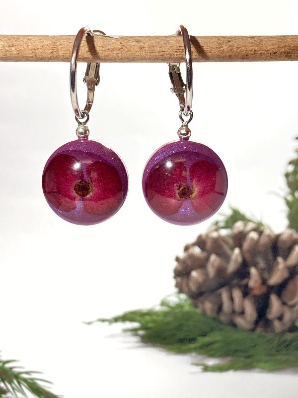 Aros tipo argolla con flores de corona de cristo encapsuladas en resina pigmentada