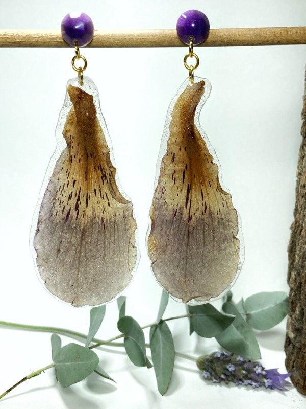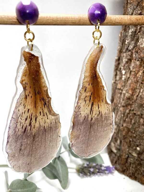 Aros de acero quirúrgico dorado con pétalos de Palo Borracho encapsulados en resina