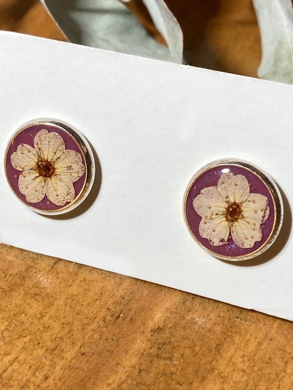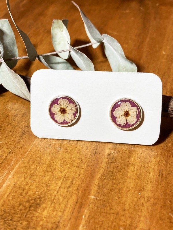 Aros pasantes de acero quirúrgico con flores de corona de novia encapsulados en resina.