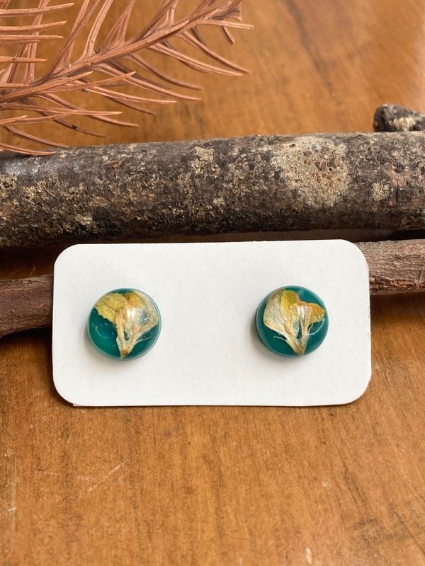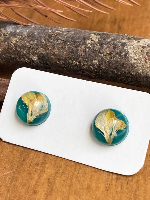 Aros pasantes de acero quirúrgico con flores de amarillas encapsulados en resina.