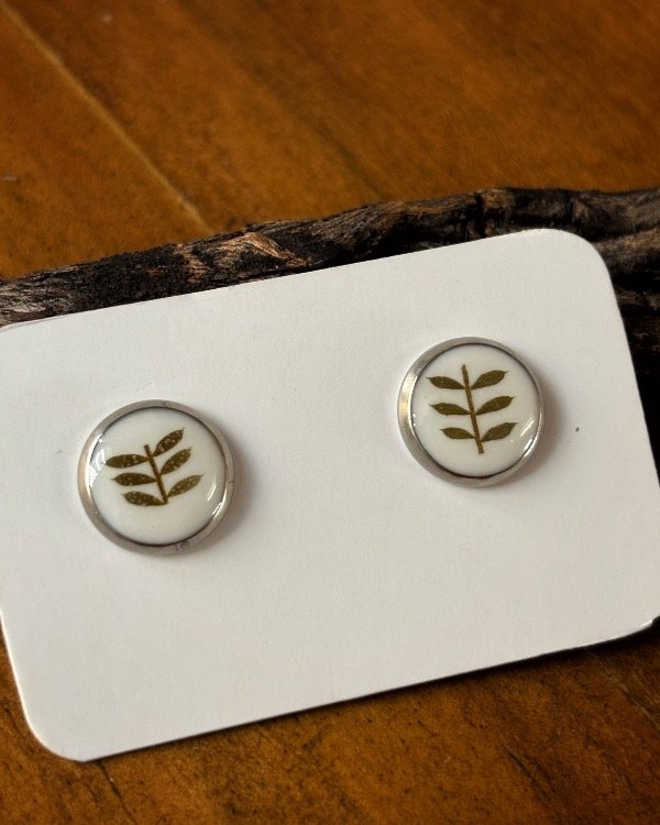 Aros pasantes de acero quirúrgico con hojas de jacarandá encapsulados en resina.