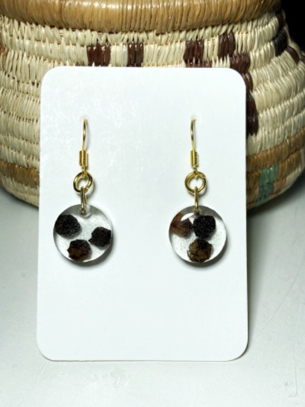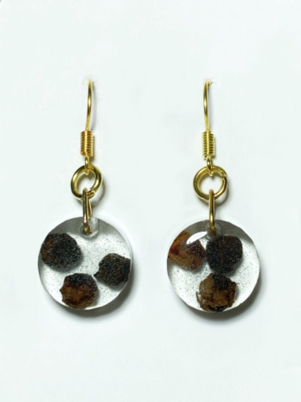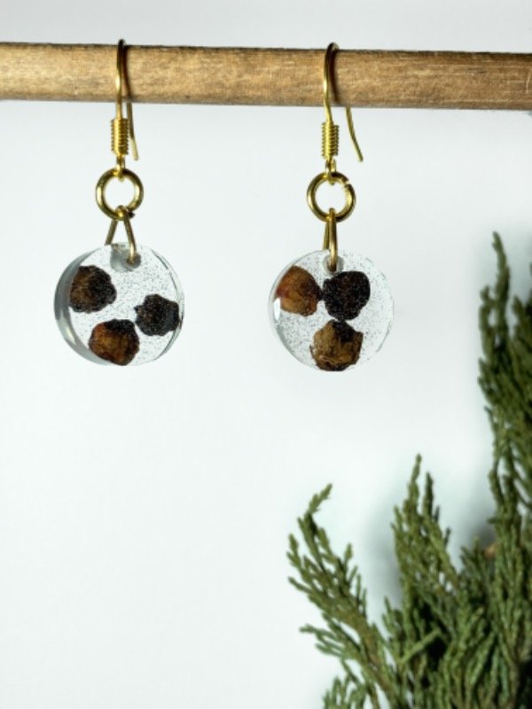 Aros metálicos dorados con granos de Pimienta negra encapsuladas en resina