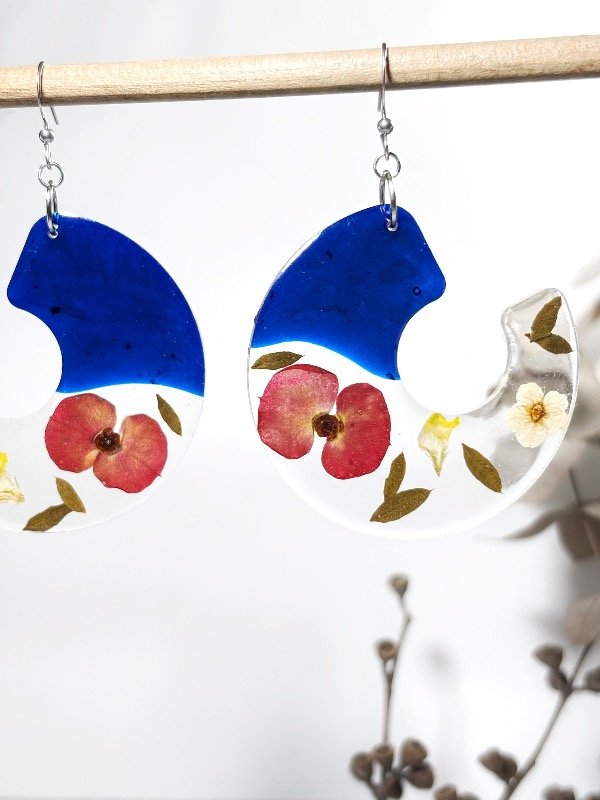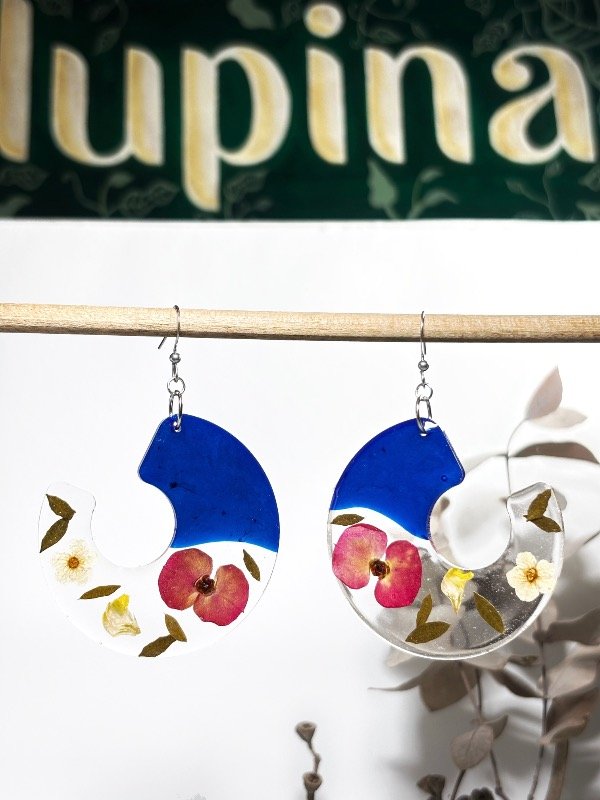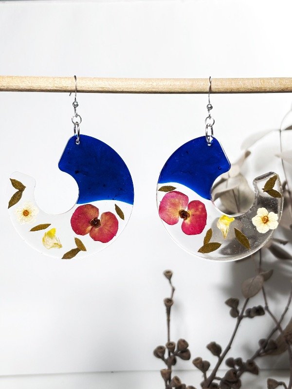 Aros de acero quirúrgico con flores de Corona de Novia, Corona de Cristo, hojas de Jacarandá y Youngia japonica encapsuladas en resina