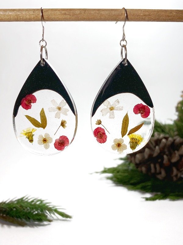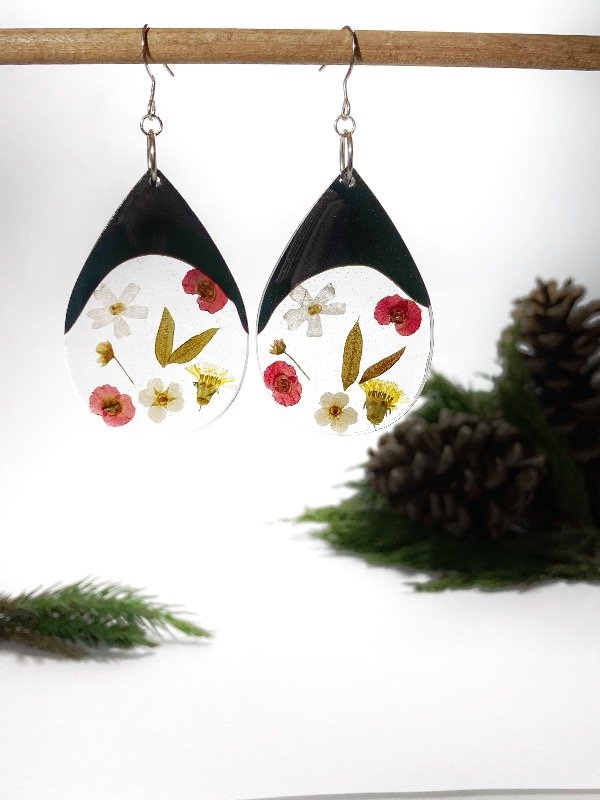 Aros de acero quirúrgico con flores de Corona de Novia, Corona de Cristo, hojas de Jacarandá y Youngia japonica encapsuladas en resina