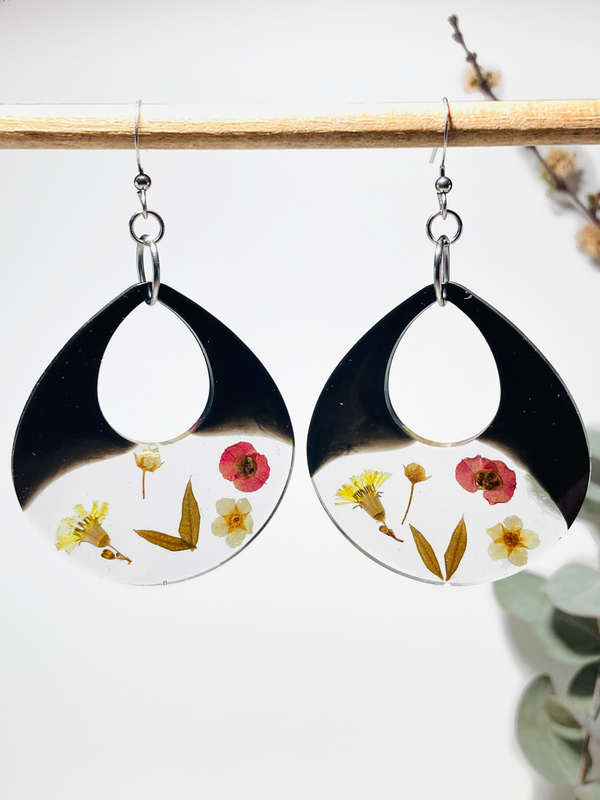 Aros de acero quirúrgico con flores de Corona de Novia, Corona de Cristo, hojas de Jacarandá y Youngia japonica encapsuladas en resina