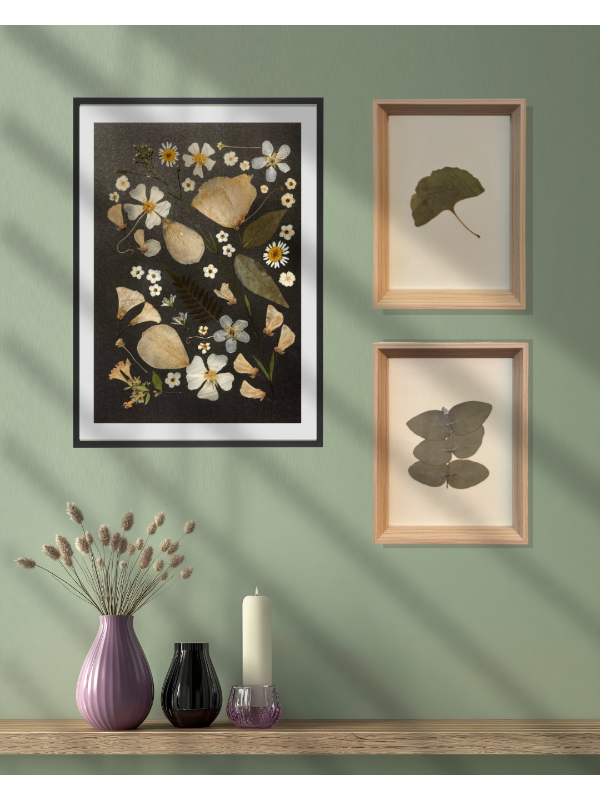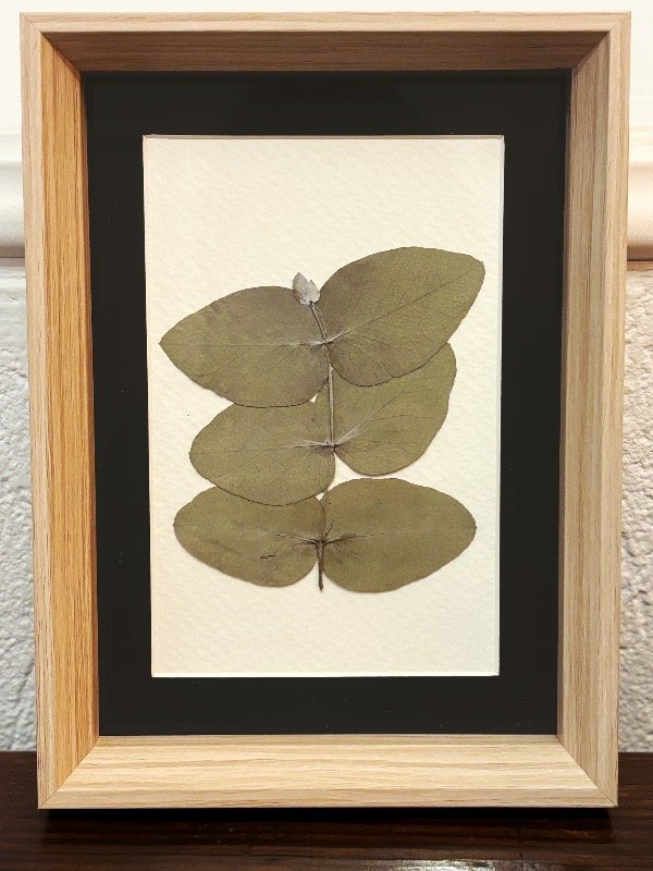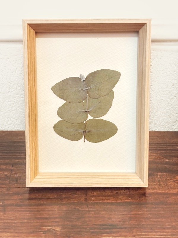 Cuadro con ramita natural de Eucalipto prensada, sobre papel especial de 13 x 18 cm
