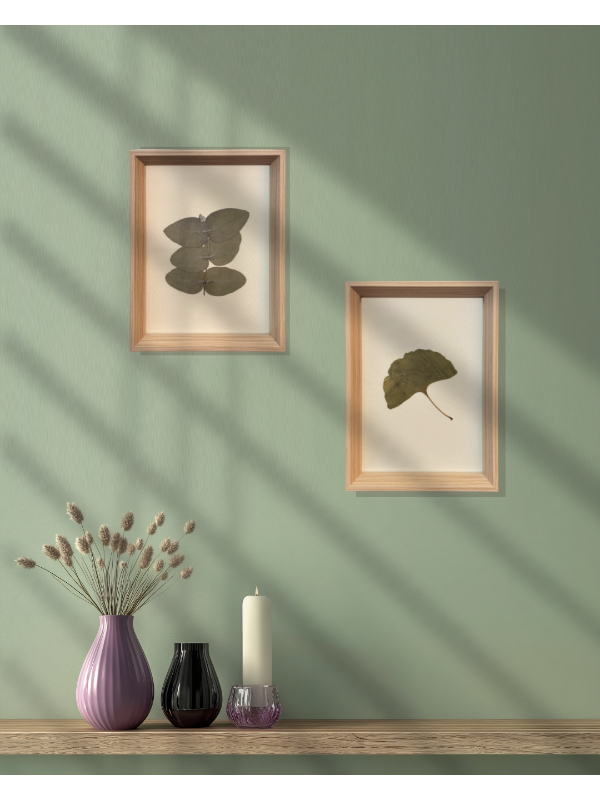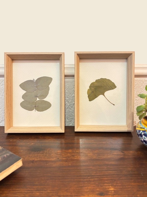 Set de dos cuadros con ramita natural de Eucalipto y con hoja de Ginkgo prensadas, sobre papel especial de 13 x 18 cm
