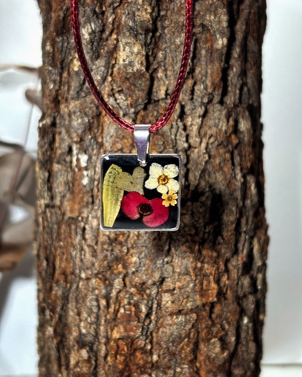 Dije en acero quirúrgico con pétalo de margarita, hojita de trébol, flor de corona de novia, de corona de cristo y verbena