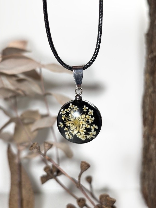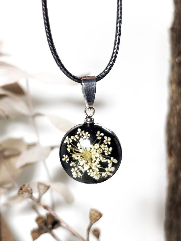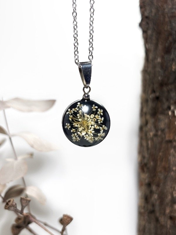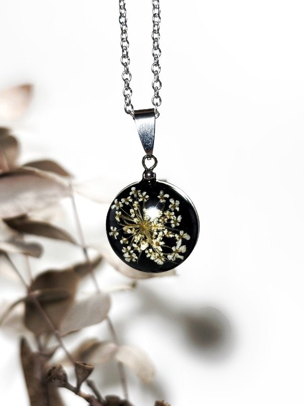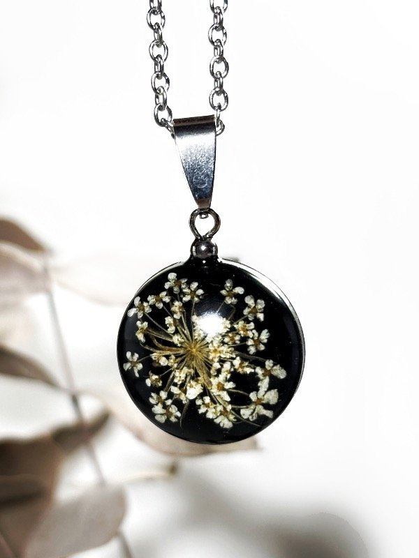 Dije en acero quirúrgico plateado con flores de Espuma de mar (Ammi majus) encapsuladas en resina.