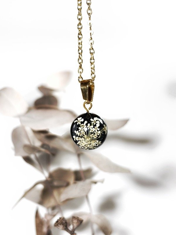 Dije en acero quirúrgico dorado con flores de Espuma de mar (Ammi majus) encapsuladas en resina.