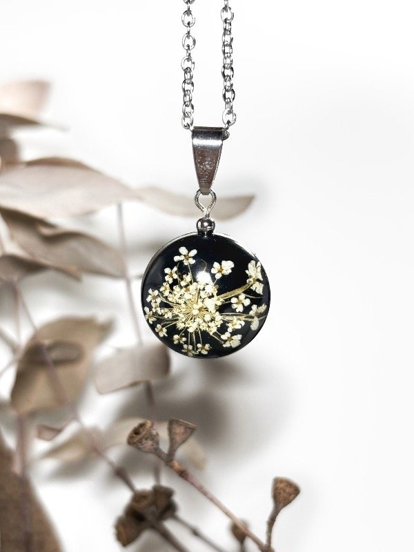 Dije en acero quirúrgico plateado con flores de Espuma de mar (Ammi majus) encapsuladas en resina.