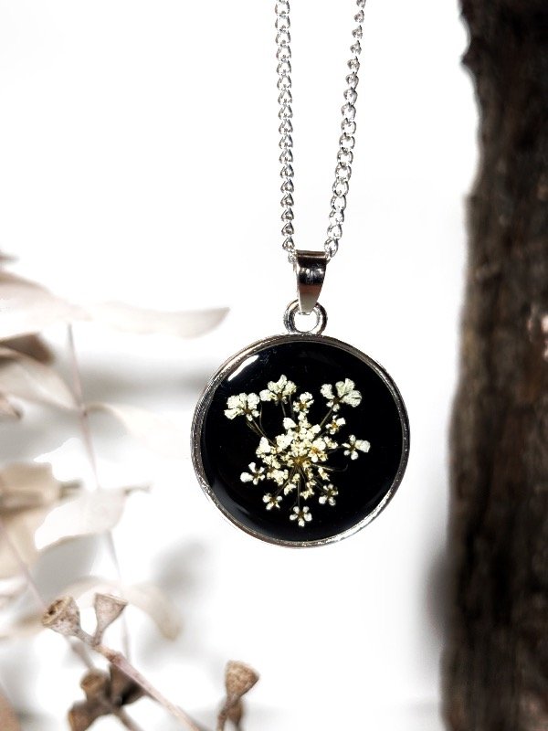 Dije con marco metálico plateado y flores de Espuma de mar (Ammi Majus)
