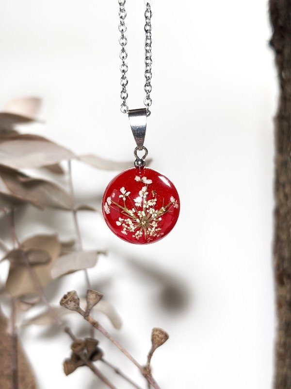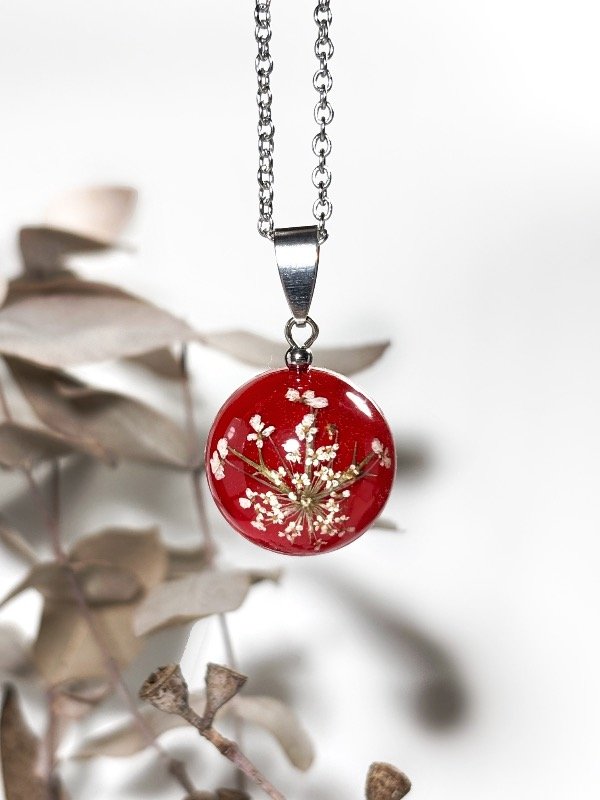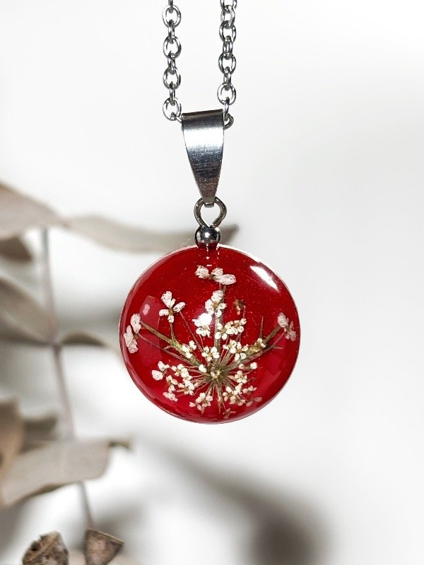 Dije en acero quirúrgico plateado con flores de Espuma de mar (Ammi majus) encapsuladas en resina.