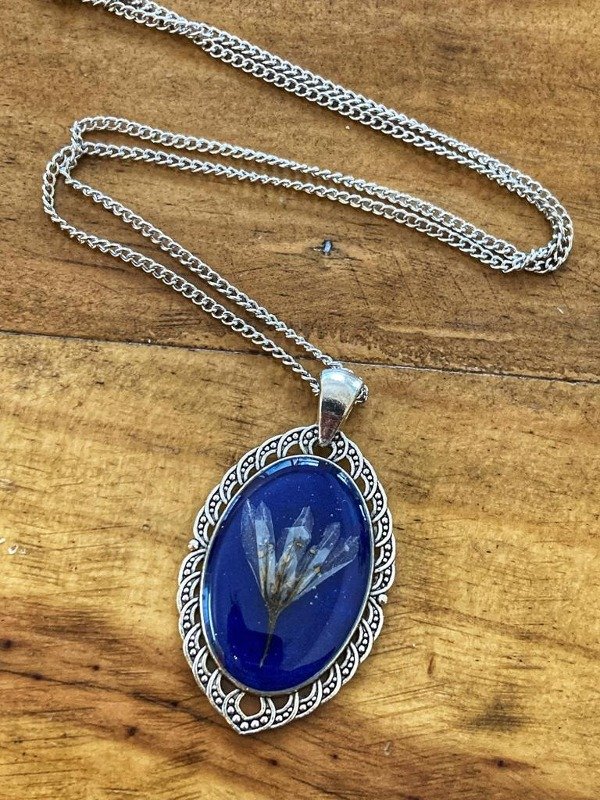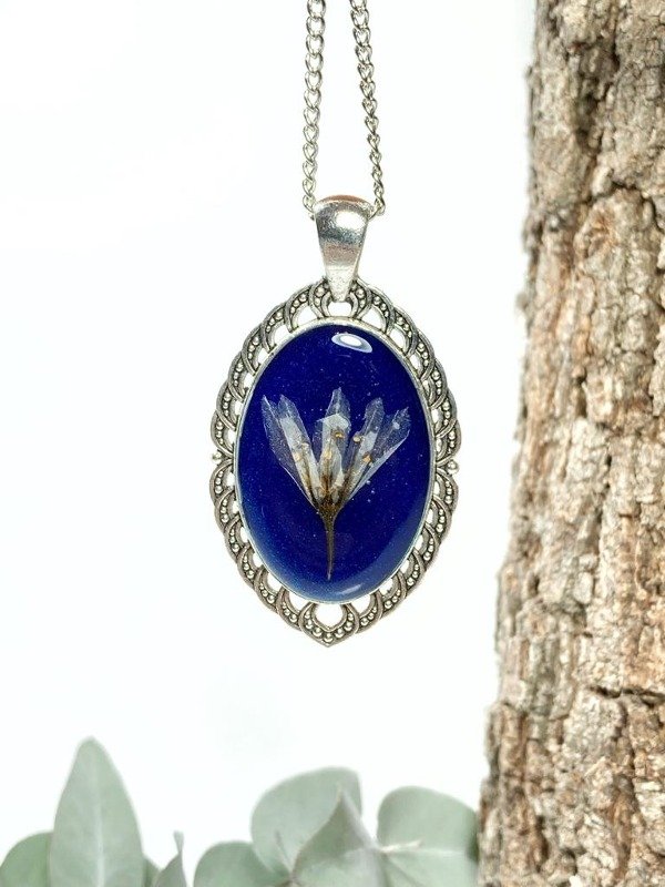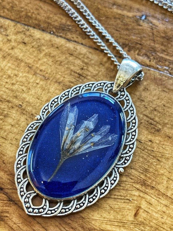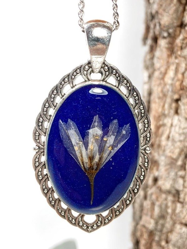 Dije con florcita de Lágrima de la Vírgen encapsulada en resina con fondo azul opaco