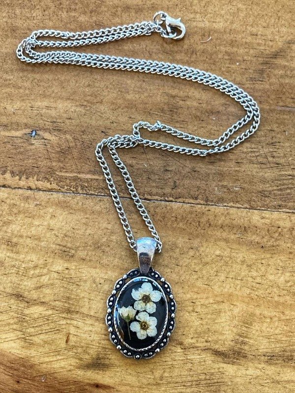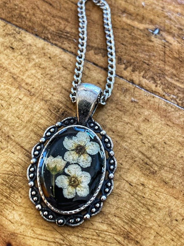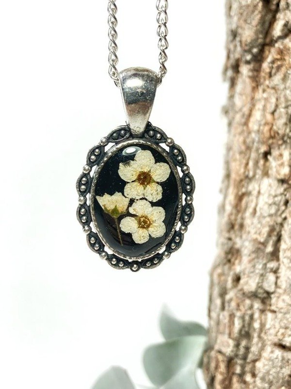 Dije con florcitas de corona de novia encapsuladas en resina con fondo negro