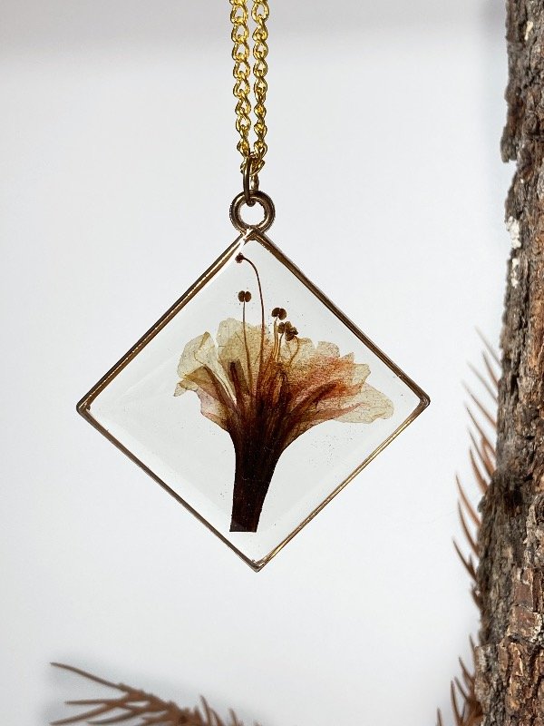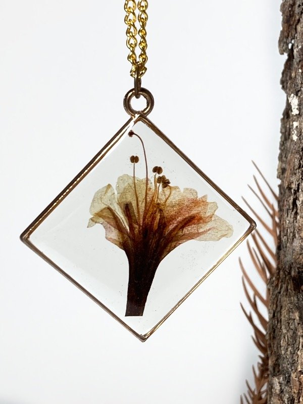 Dije con marco metálico dorado y flor de Don Diego de noche