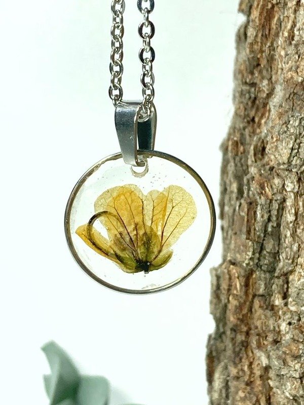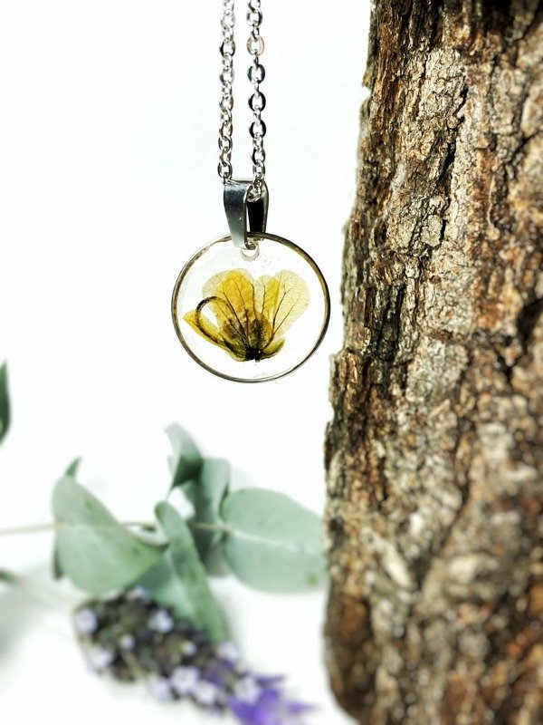 Dije en Acero quirúrgico plateado con florcita encapsulada en resina