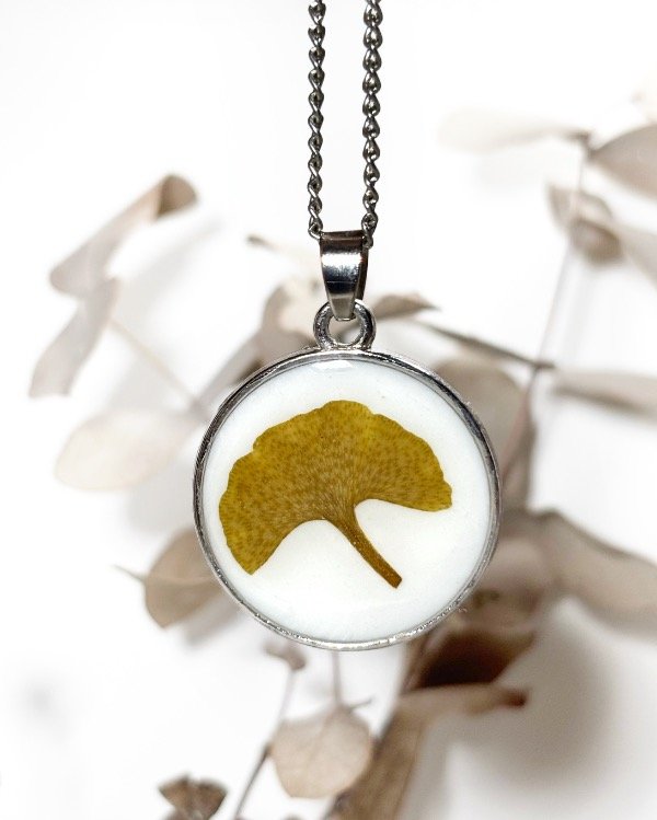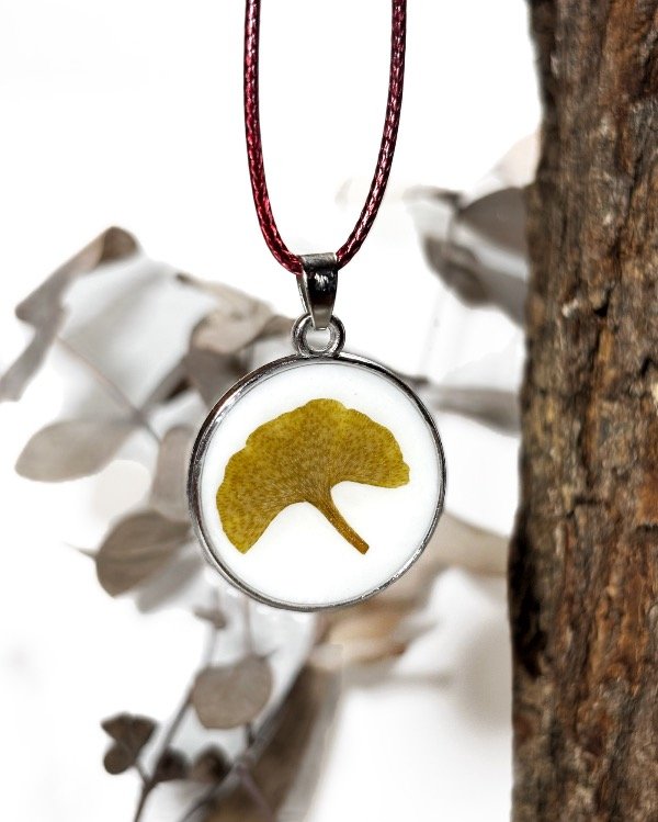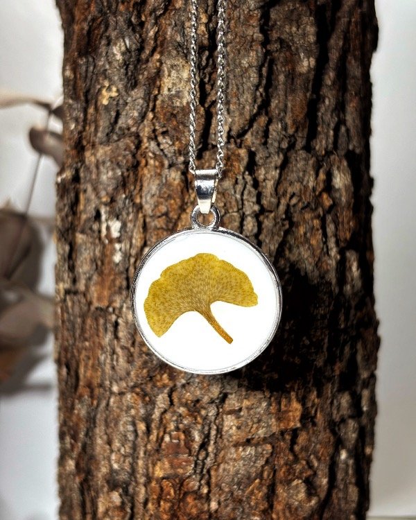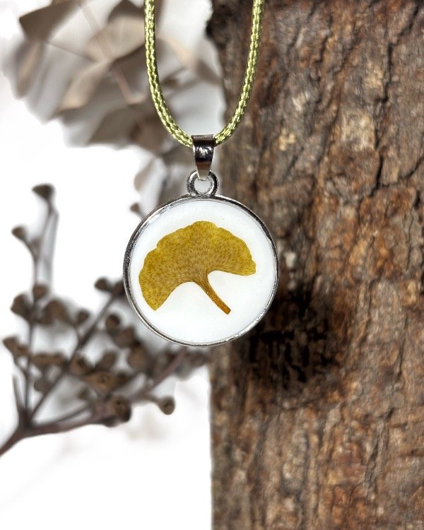 Dije con marco metálico plateado y hoja de Ginkgo Biloba