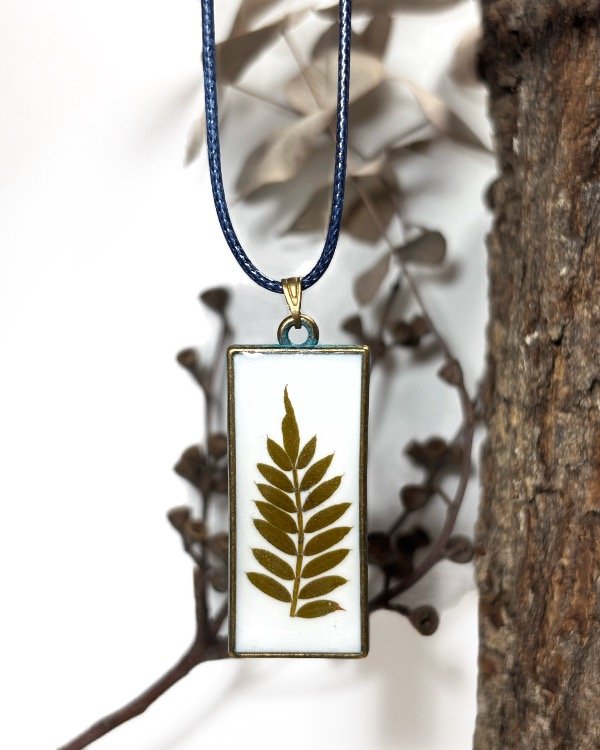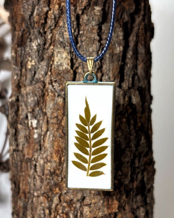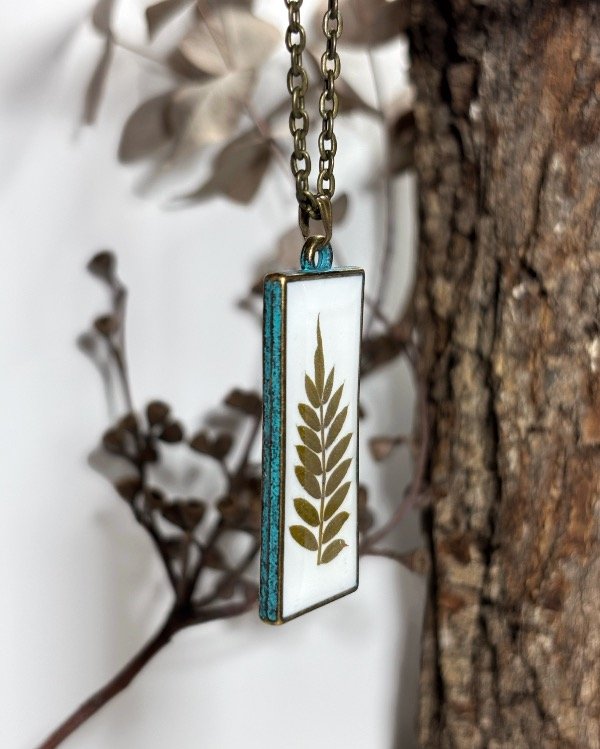 Dije metálico bronce con hojas de Jacarandá encapsuladas en resina