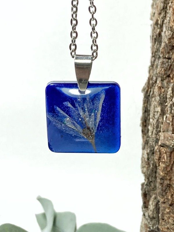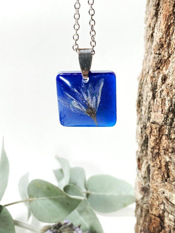 Dije en Acero quirúrgico plateado con florcita de Lágrima de la Vírgen encapsulada en resina con fondo azul opaco