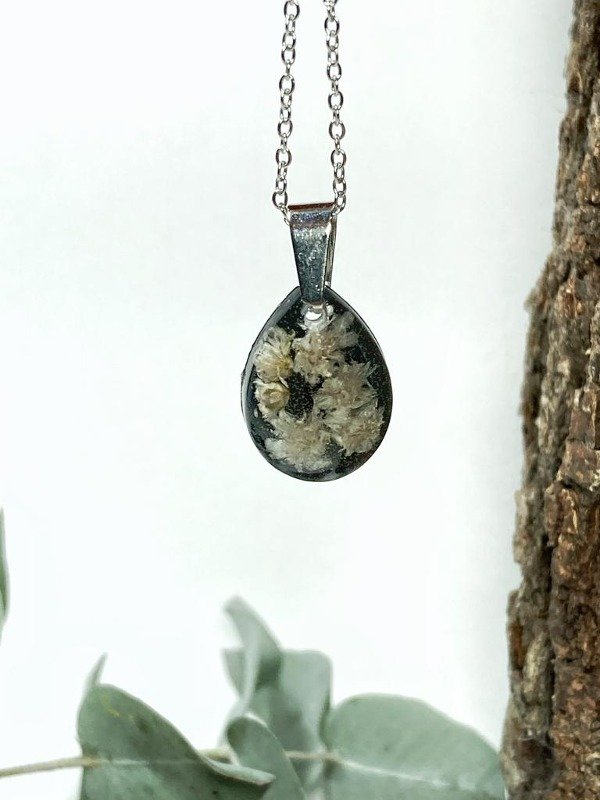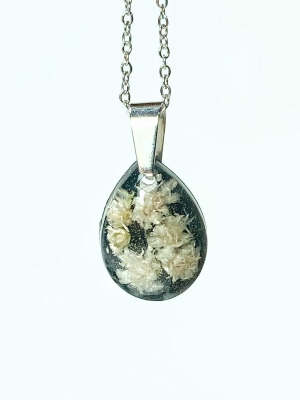 Dije en Acero quirúrgico plateado con florcitas encapsuladas en resina con fondo negro