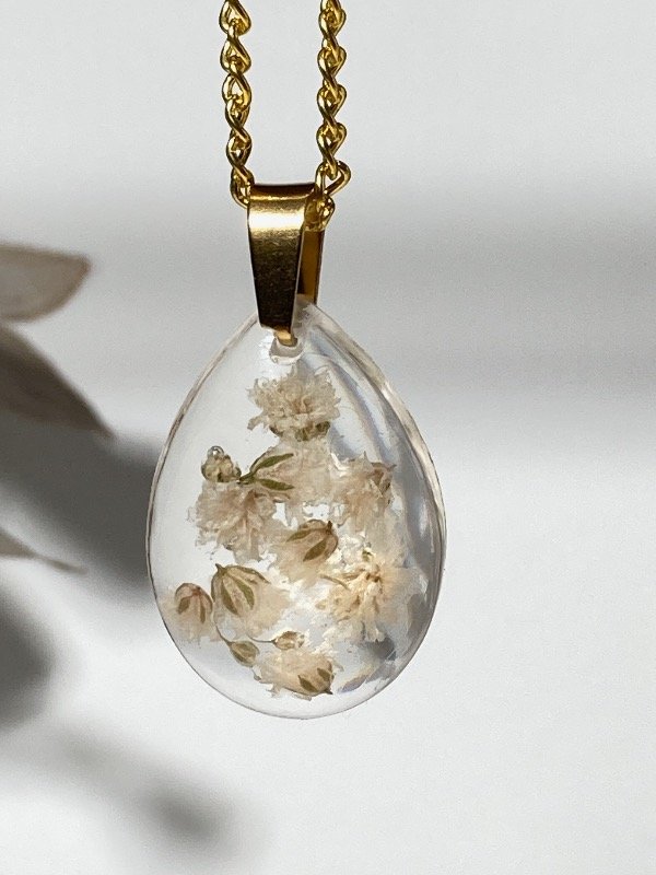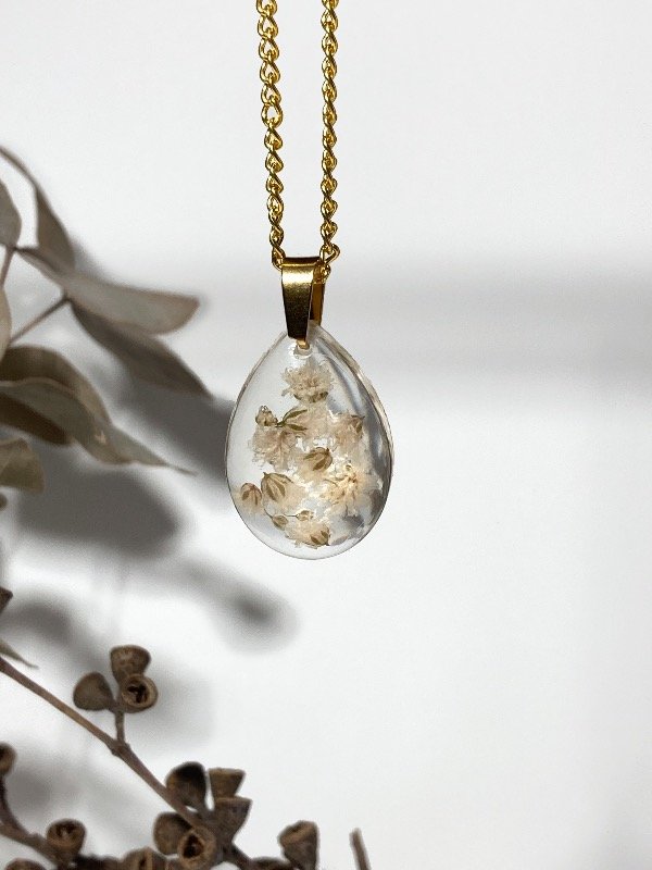 Dije en Acero quirúrgico con flores de "Nubes" (Gypsophila Paniculata) encapsulados en resina