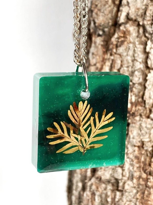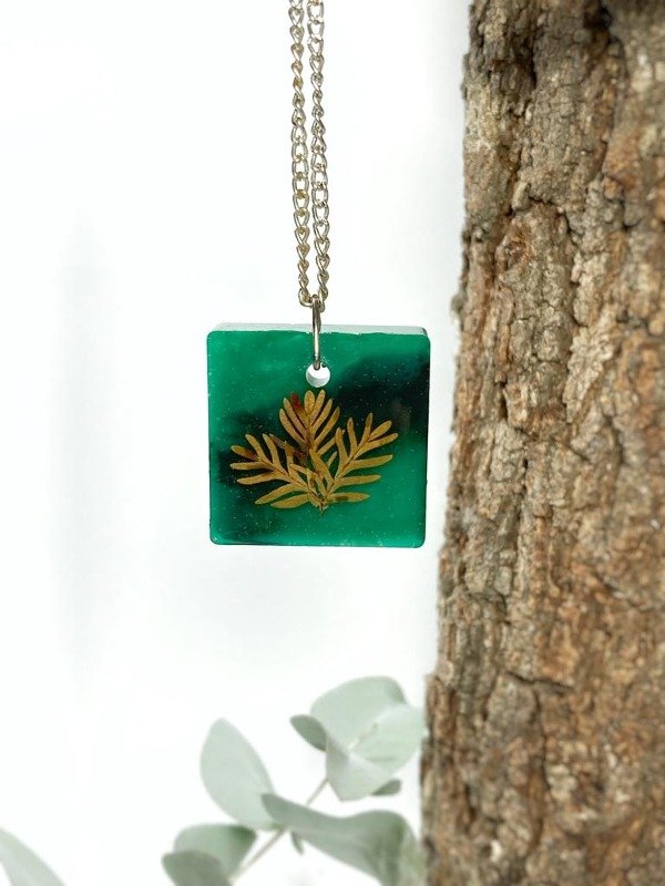 Dije con ramitas de pino encapsuladas en resina con fondo verde y negro