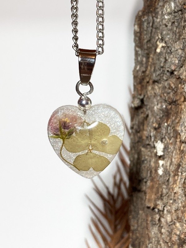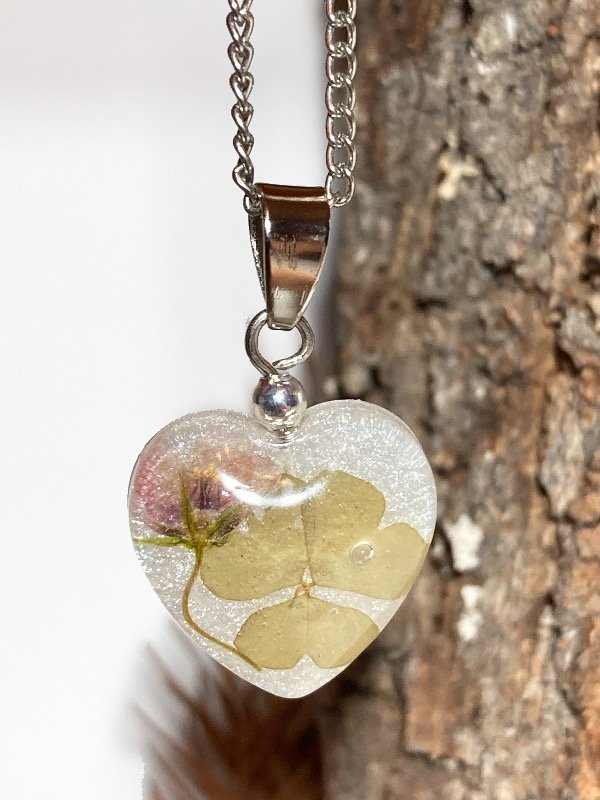 Dije metálico plateado con fragmentos botánicos encapsulados en resina