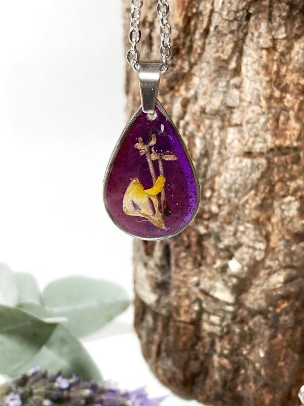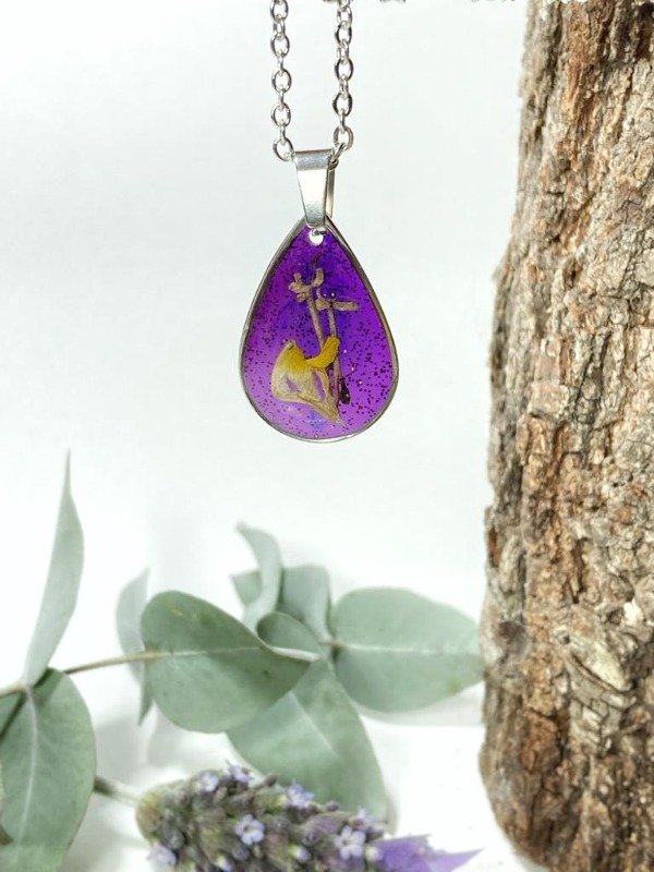 Dije en Acero quirúrgico plateado con florcitas encapsuladas en resina y fondo violeta brillante