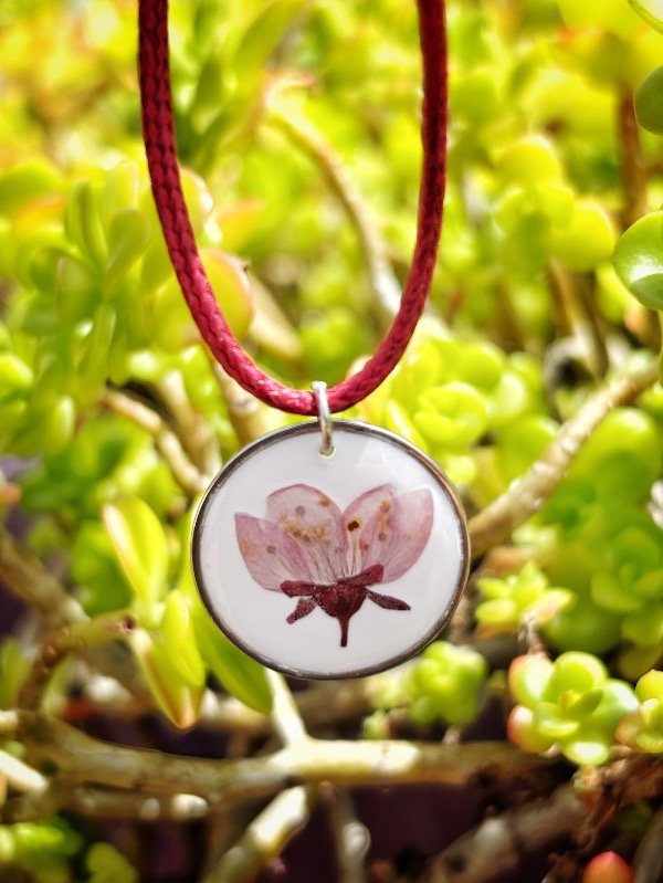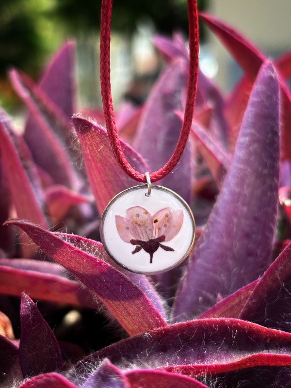 Dije en Acero quirúrgico con de flor de Ciruelo encapsulados en resina